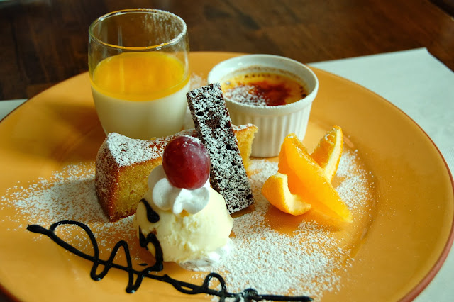 マンゴーソースのプリン・クレームブリュレ・しっとりケーキ・バニラアイス。