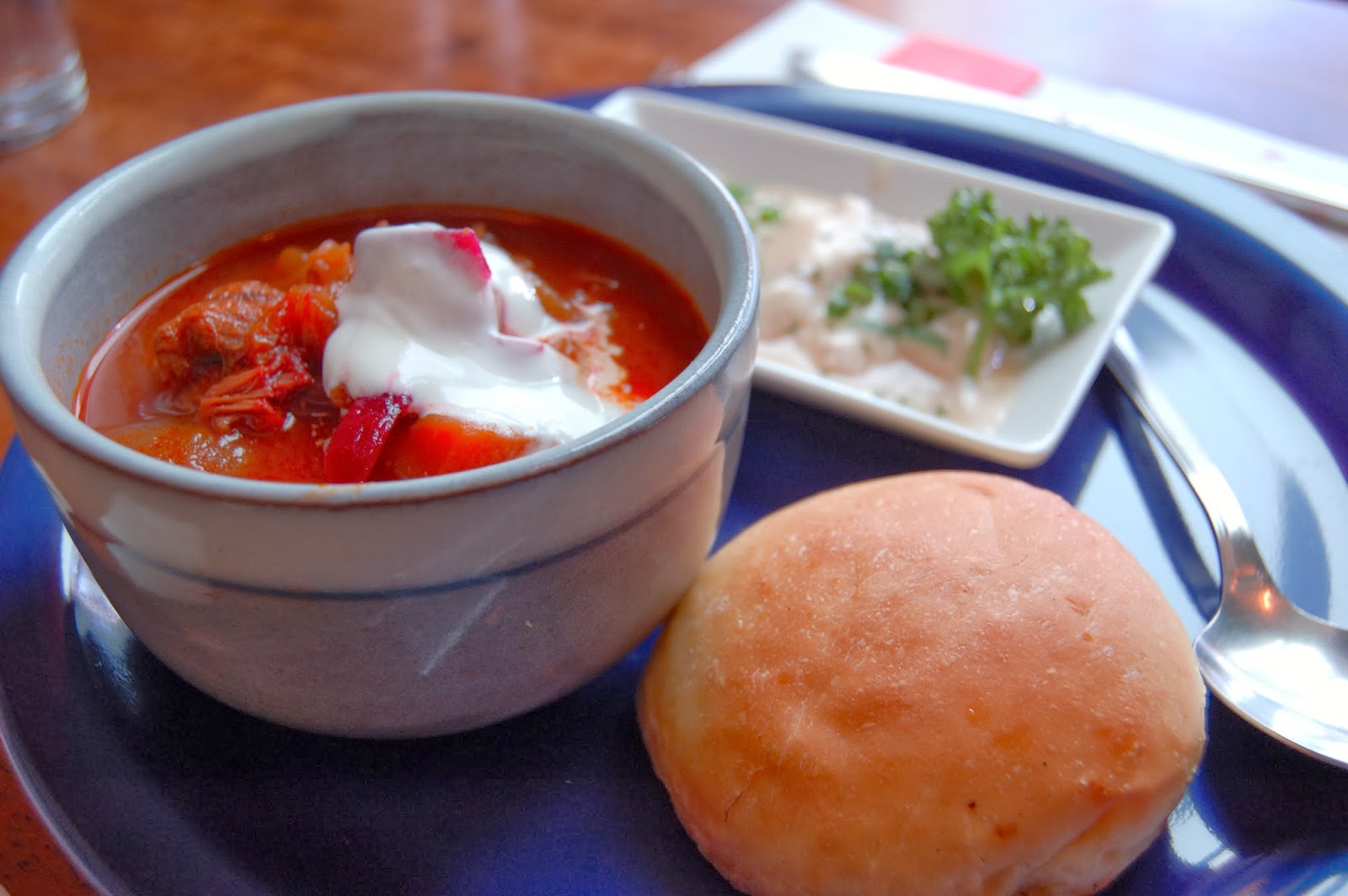 「牛肉と野菜の煮込みボルシチプレート」本日の気まぐれマリネとピロシキ付き。